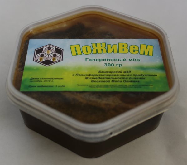 Мёд c восковой молью» “ПоЖиВеМ” (Галериновый мёд) сочетает все уникальные полезные свойства ферментов личинок восковой моли огневки и башкирского мёда, взаимно дополняя и увеличивая эффективность друг друга.